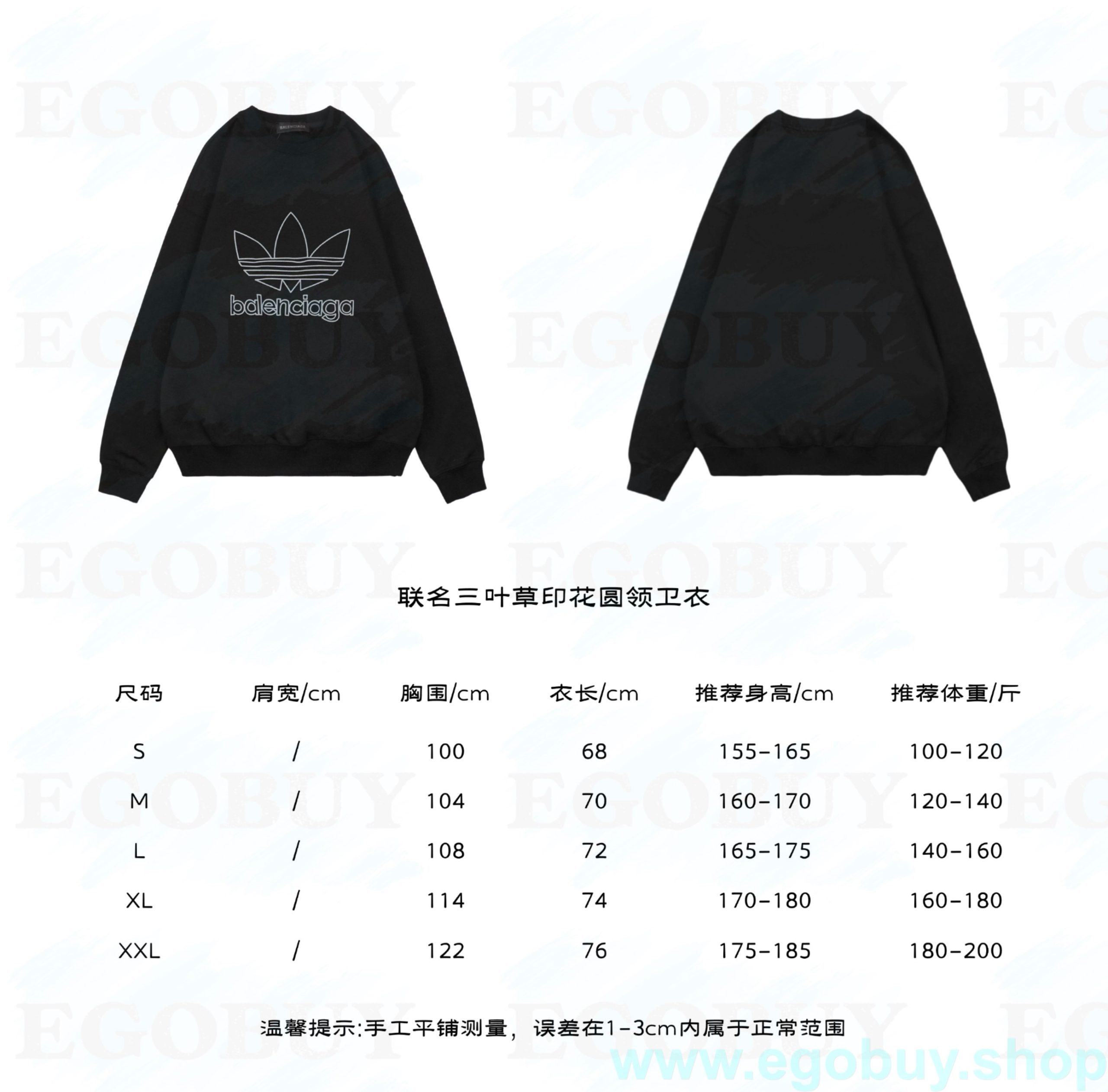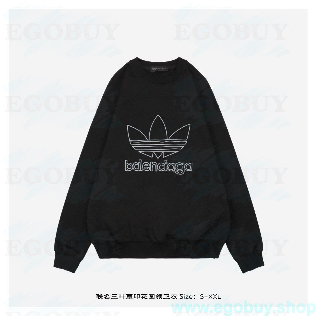 Balenciaga/巴黎世家 24Fw 联名三叶草印花圆领卫衣 面料采用400克重双股大毛圈面料,定制32支螺纹,成衣两遍水洗处理,面料舒适亲肤无异感,定制定染面料,纺织密度高,垂感佳,不易变形,厚织感加上紧密纺纱工艺,不会影响卫衣的透气性,成色的饱和度很高,进口数码直喷印花工艺,百搭好看的一款卫衣,宽松版型遮肉显瘦不挑人 Size:S-XXL