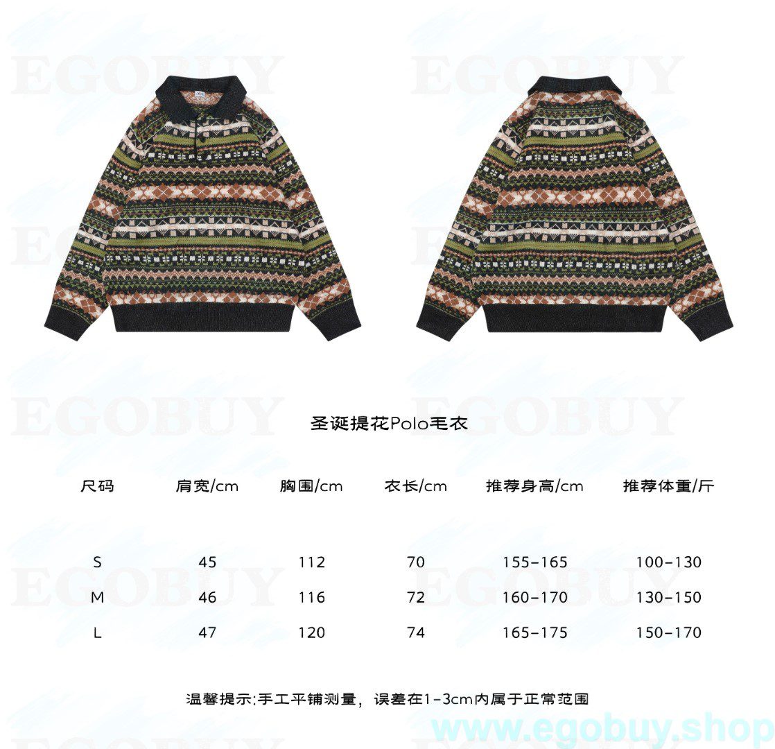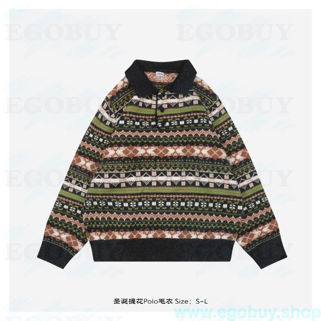 Loewe/罗意威 24Fw 圣诞提花Polo毛衣 采用60%棉羊毛+40%棉混纺,采用进口德国斯托尔织片,毛织机器采用德国进口机器每件衣服耗时3个小时才能织成,进口7针提花工艺纱线清晰有度有纹理,表层有明显的羊毛纤维,满身全幅提花,该款面料手感非常柔顺,上身舒适,Polo翻领螺纹设计风格百搭又时尚,双系统提花定织扁机制成,纽扣采用天然树脂纽扣,三标辅料配套齐全,男女同款 Size:S-L