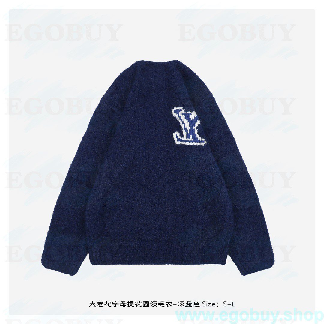 LOUIS VUITTON/路易威登 LV 23Fw 大老花字母提花圆领毛衣-深蓝色 特种圈圈纱弹性大做到版型完美还原,成衣布面类似泰迪熊的毛感,前后打色3次,羊毛混纺材质,真实含量,正3针电脑提花工艺,5针手工缝盘,前后Logo提花是羊毛,且做到完美难度巨大,下摆领口袖口全部加20/70高弹丝,不会变形,定制辅料三标,男女同款 Size:S-L