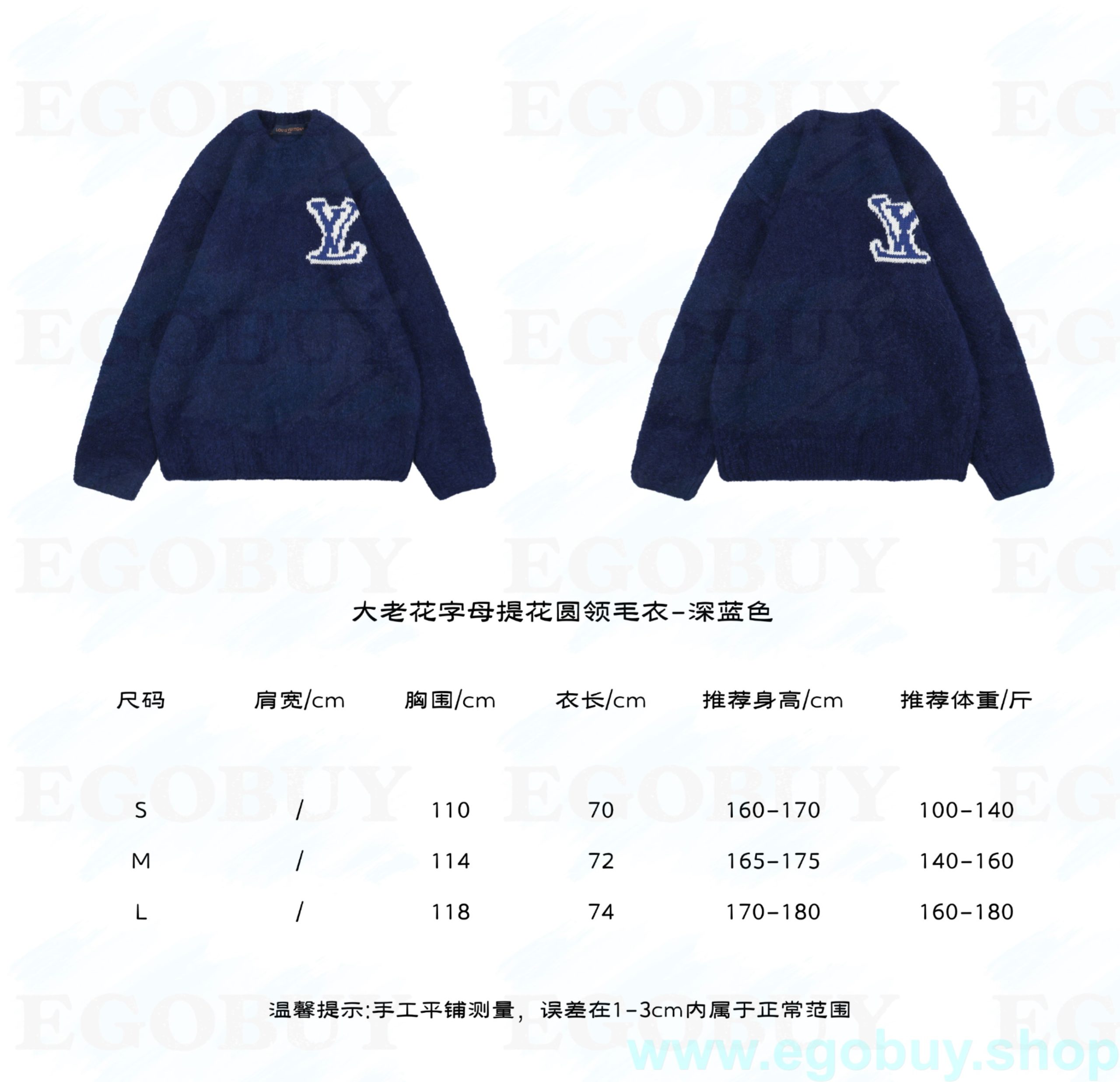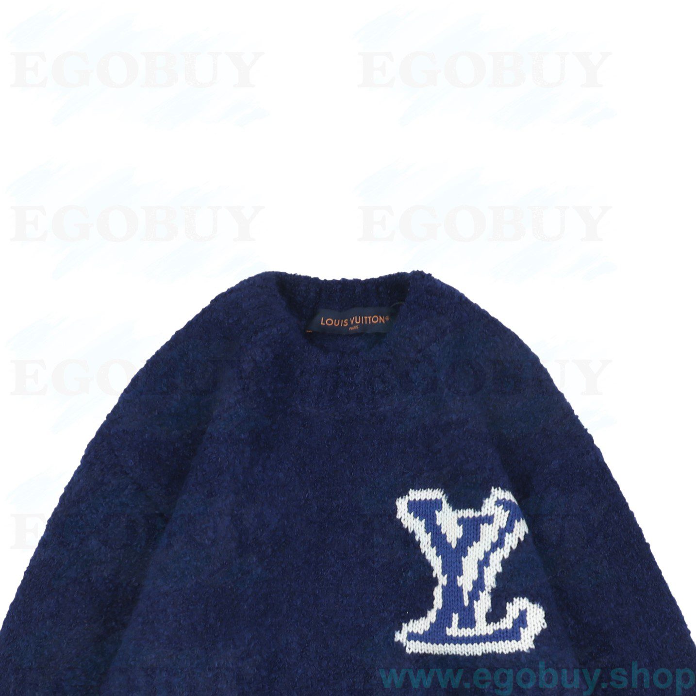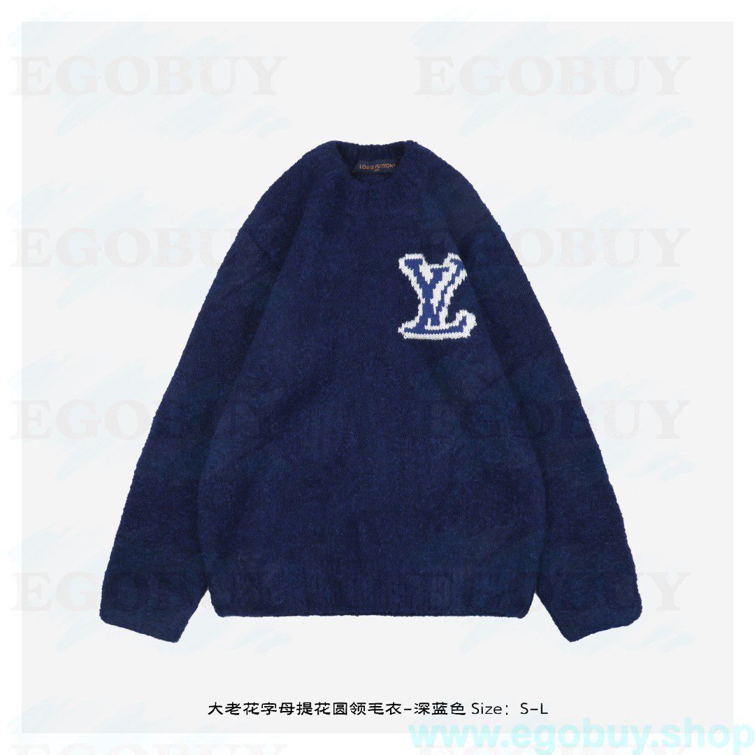 LOUIS VUITTON/路易威登 LV 23Fw 大老花字母提花圆领毛衣-深蓝色 特种圈圈纱弹性大做到版型完美还原,成衣布面类似泰迪熊的毛感,前后打色3次,羊毛混纺材质,真实含量,正3针电脑提花工艺,5针手工缝盘,前后Logo提花是羊毛,且做到完美难度巨大,下摆领口袖口全部加20/70高弹丝,不会变形,定制辅料三标,男女同款 Size:S-L