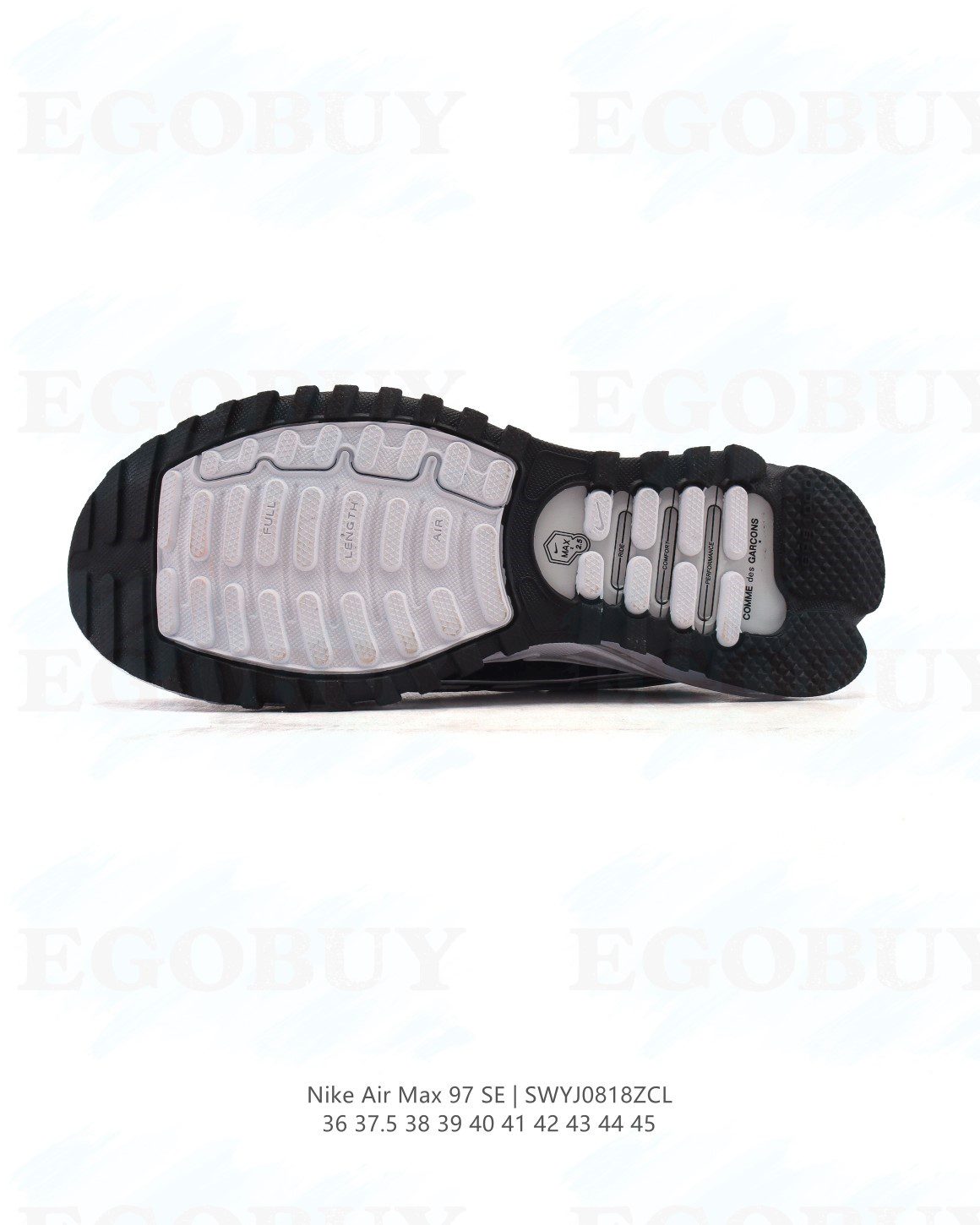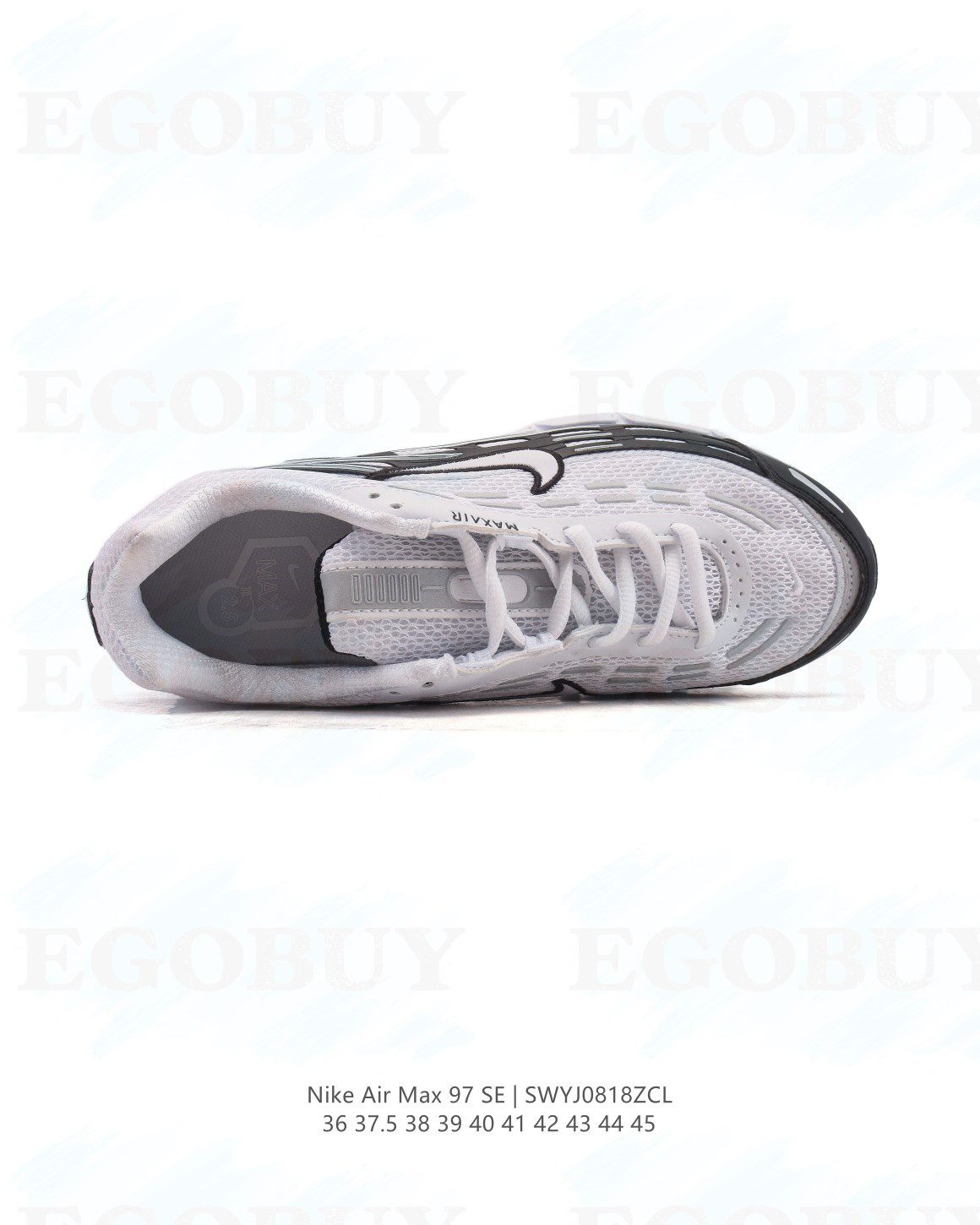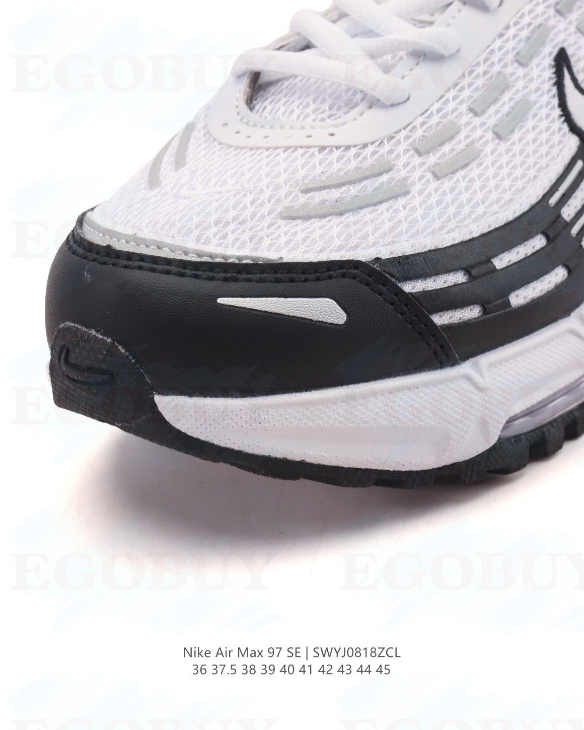 Nike/耐克 Nike Air Max 97 SE 气垫缓震男士跑步鞋 厚底增高百搭运动鞋。以织物材料以及皮革材质搭配而成 鞋侧的走线部分做了一个解构的处理,不同材料的叠加使原本的叠加线条造型更加突出,层次感明显。另外,超大超厚的气垫在视觉上充满冲击感,并且增高效果更好。