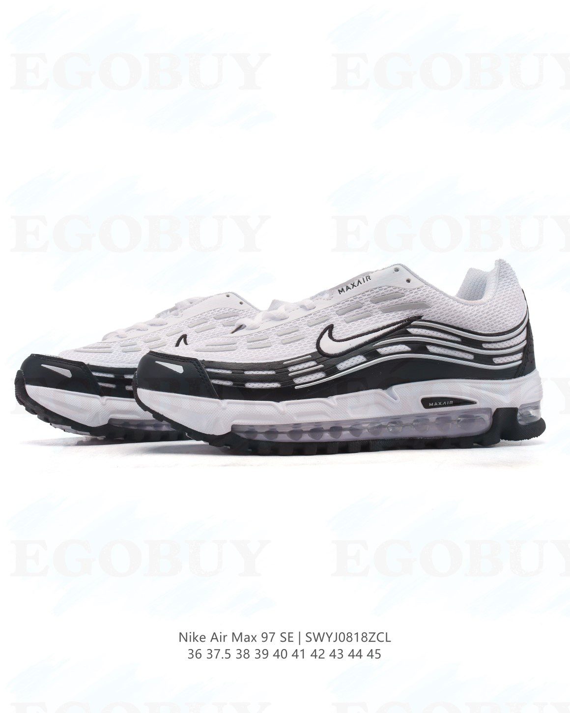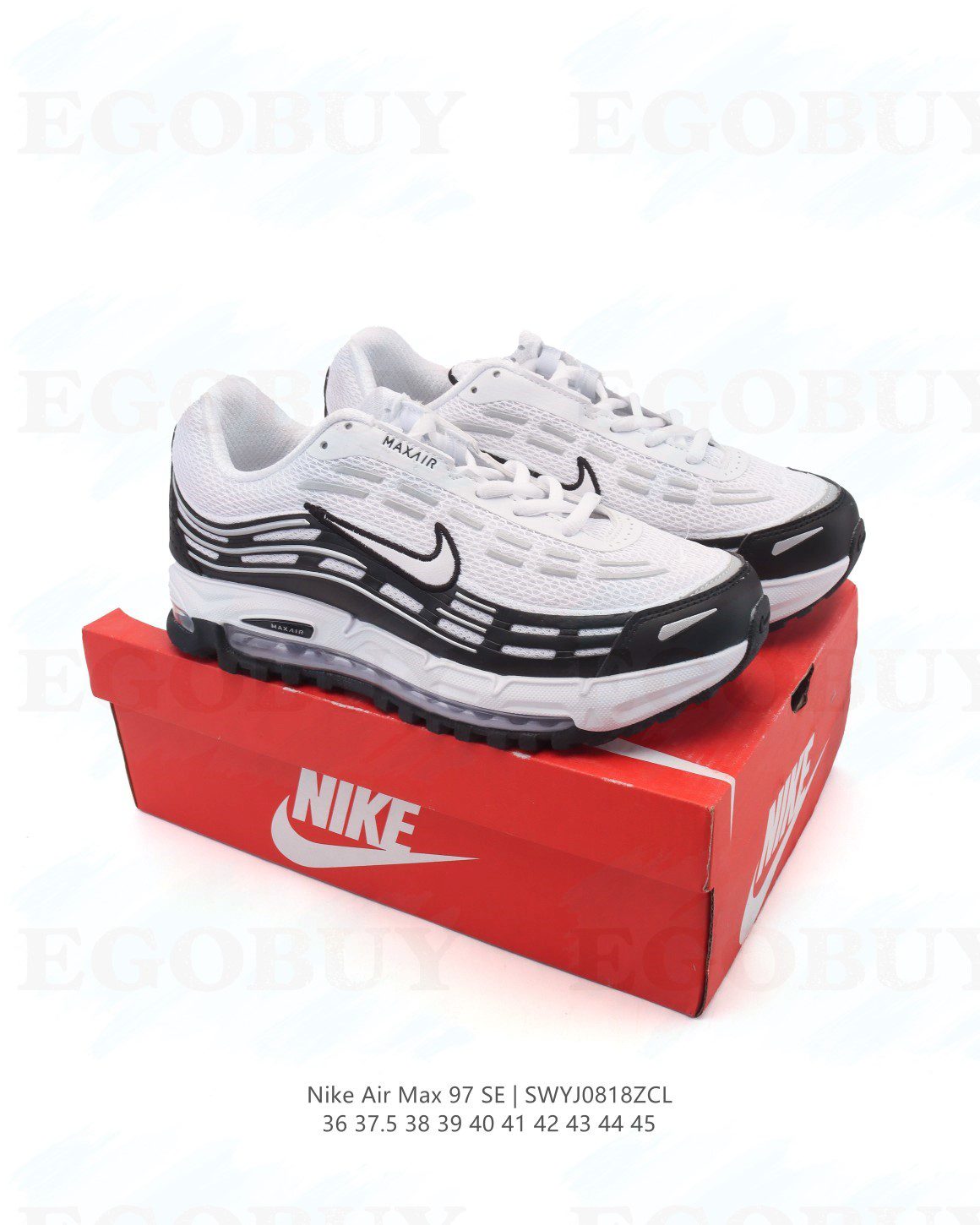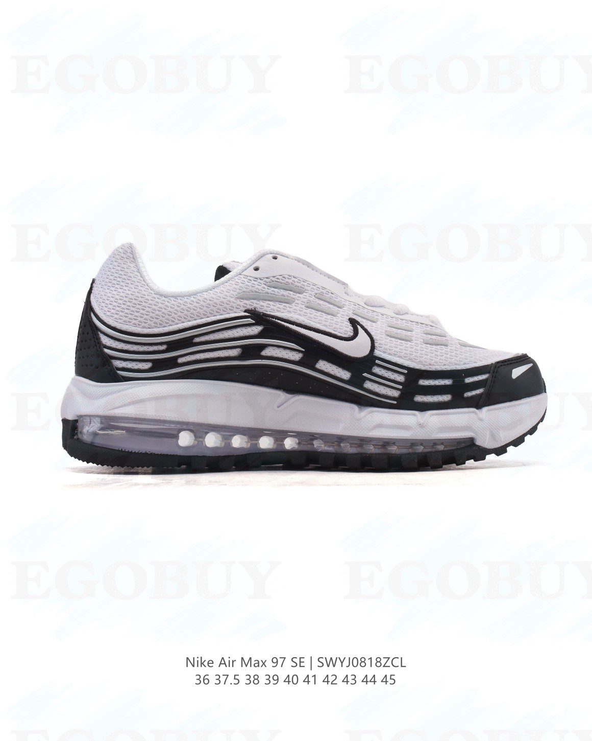 Nike/耐克 Nike Air Max 97 SE 气垫缓震男士跑步鞋 厚底增高百搭运动鞋。以织物材料以及皮革材质搭配而成 鞋侧的走线部分做了一个解构的处理,不同材料的叠加使原本的叠加线条造型更加突出,层次感明显。另外,超大超厚的气垫在视觉上充满冲击感,并且增高效果更好。