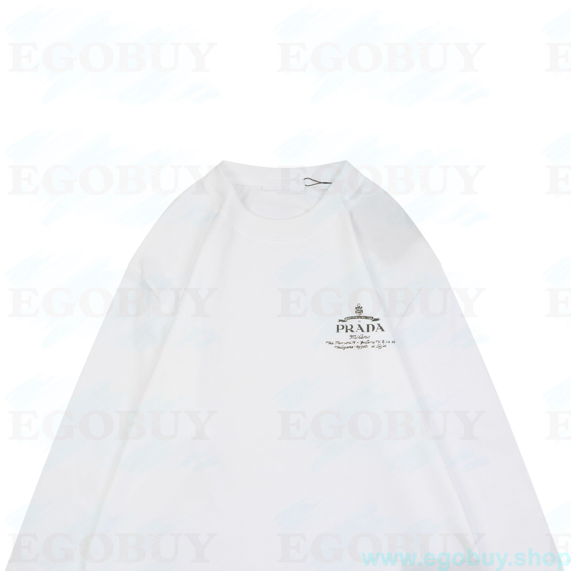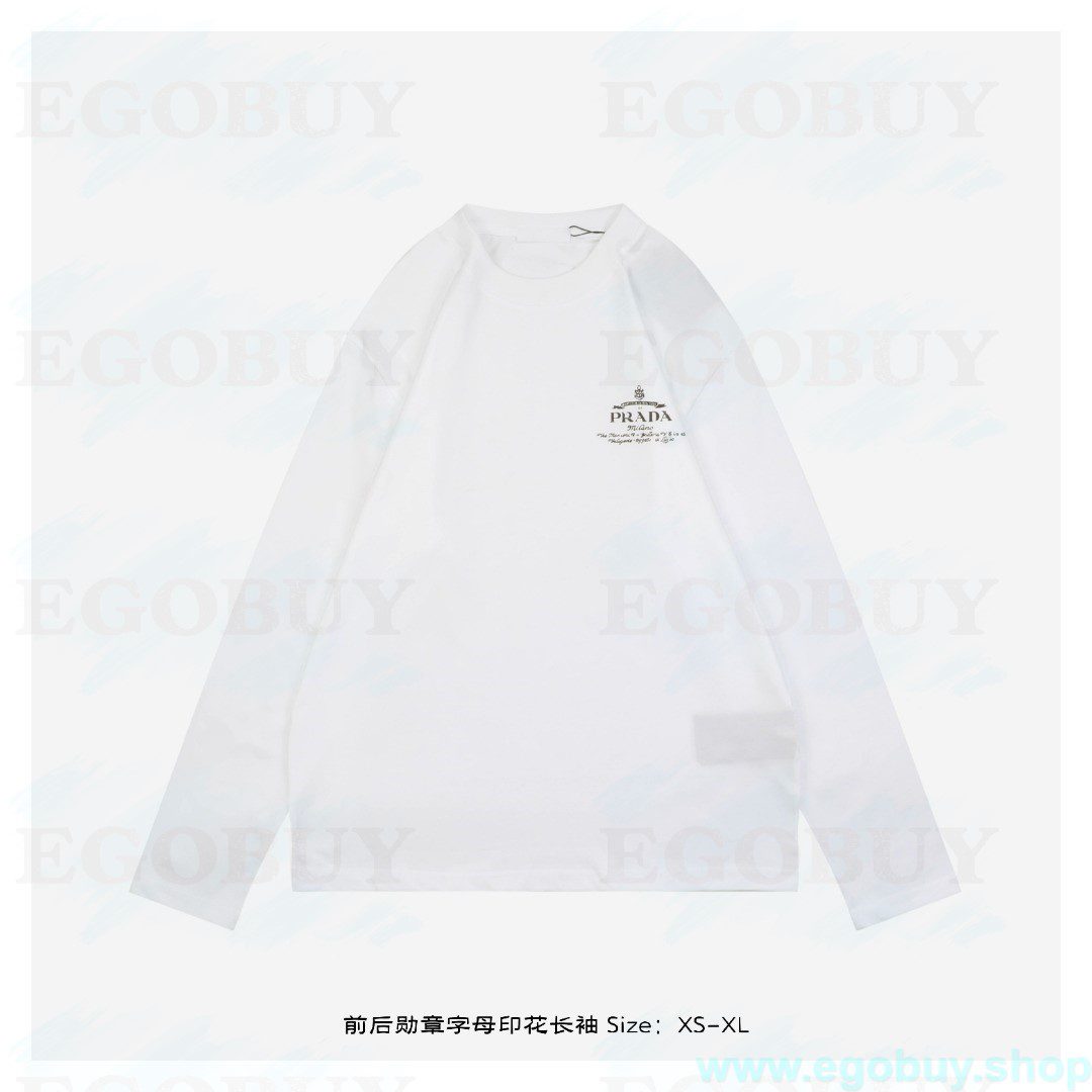 Prada/普拉达 25Fw 前后勋章字母印花长袖 面料采用260克重精梳棉,定制32支1*1螺纹,成衣两遍水洗处理,面料舒适亲肤无异感,定制定染面料,纺织密度高,垂感佳,不易变形,厚织感加上紧密纺纱工艺,不会影响面料的透气性,成色的饱和度很高,进口数码直喷印花工艺,百搭好看的一款短袖,宽松版型遮肉显瘦不挑人